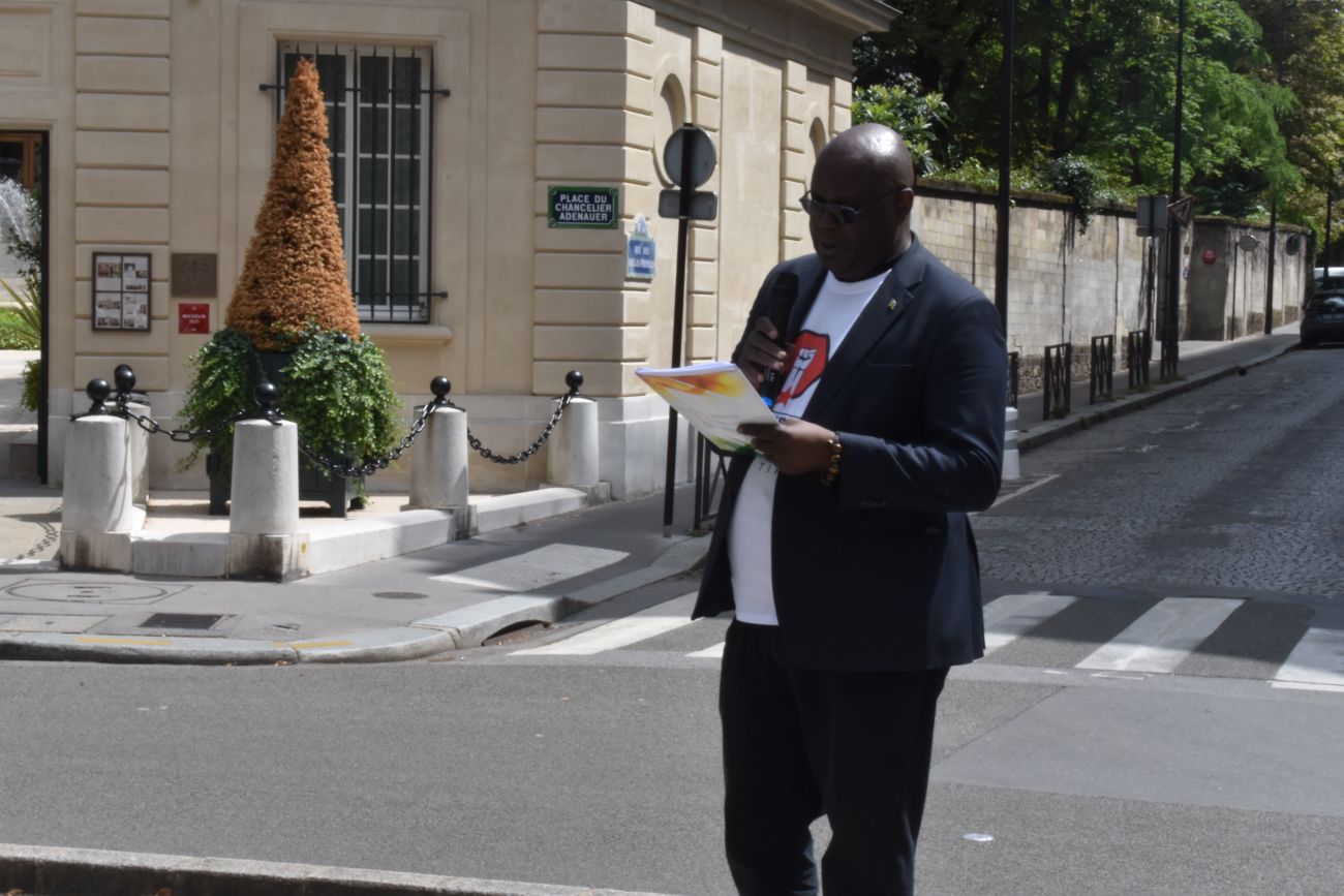 Jean-François AKANDJI-KOMBE lors du rassemblement devant l'ambassade du Tchad à Paris (France)